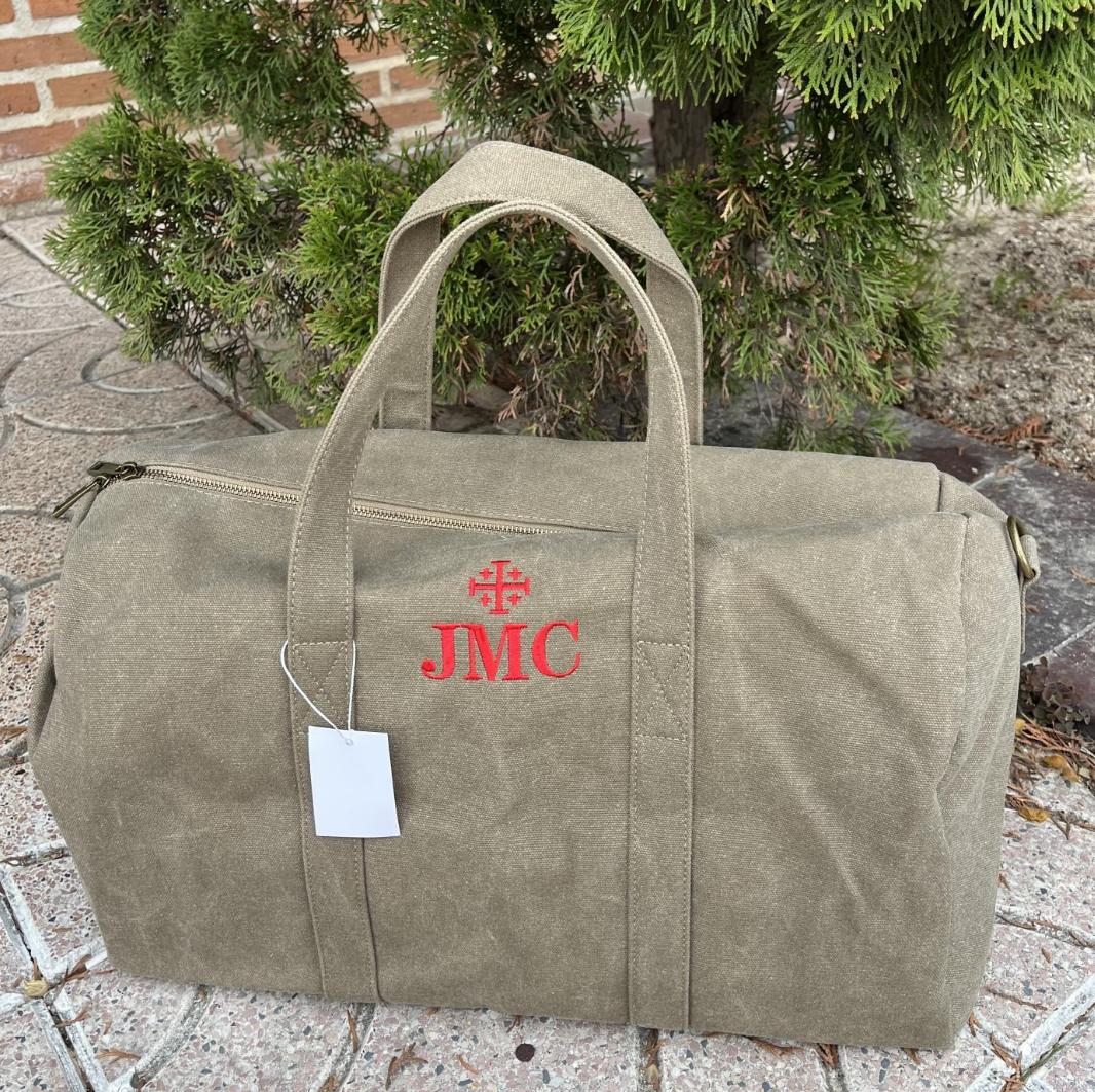 Maleta bordada con la Cruz de Jerusalén, puedes añadir tus iniciales para personalizarla y elegir el color del bordado