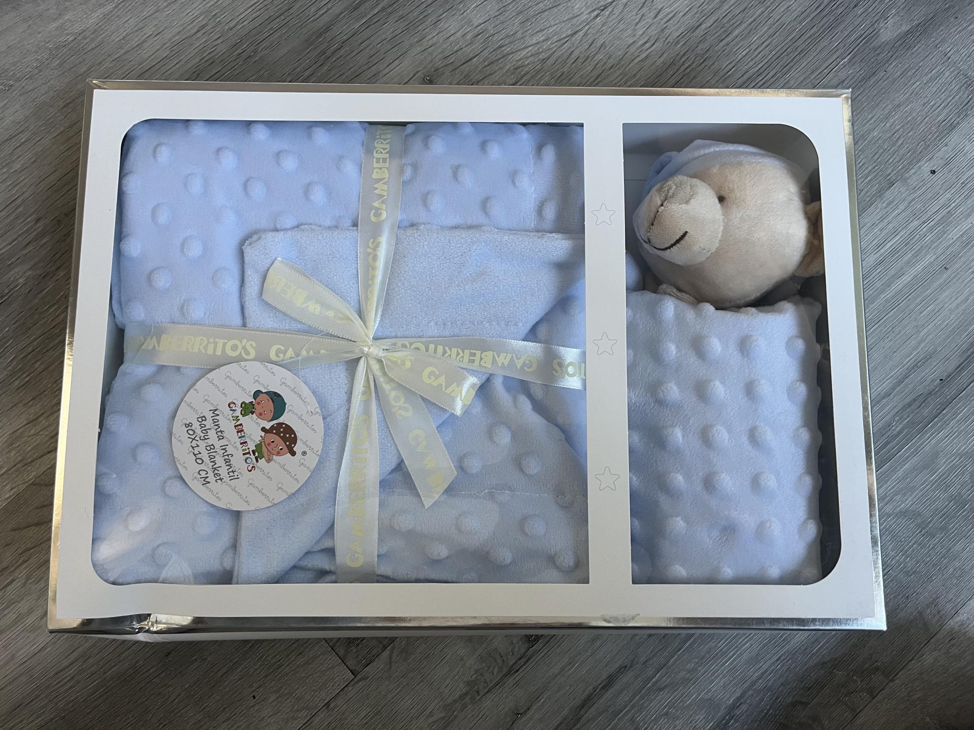 Set de regalo dos piezas manta de topos tacto aterciopelado y doudou a juego en forma de oso. embalaje de el producto en caja.