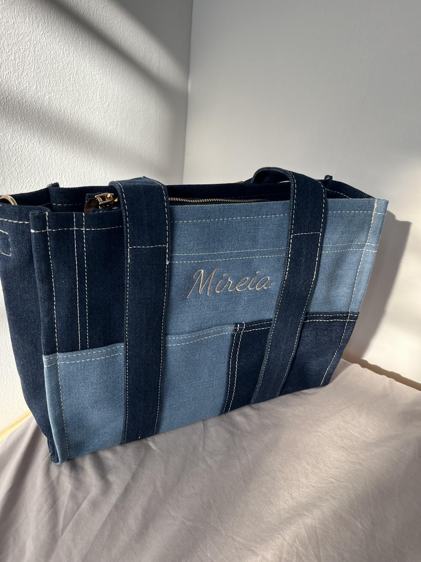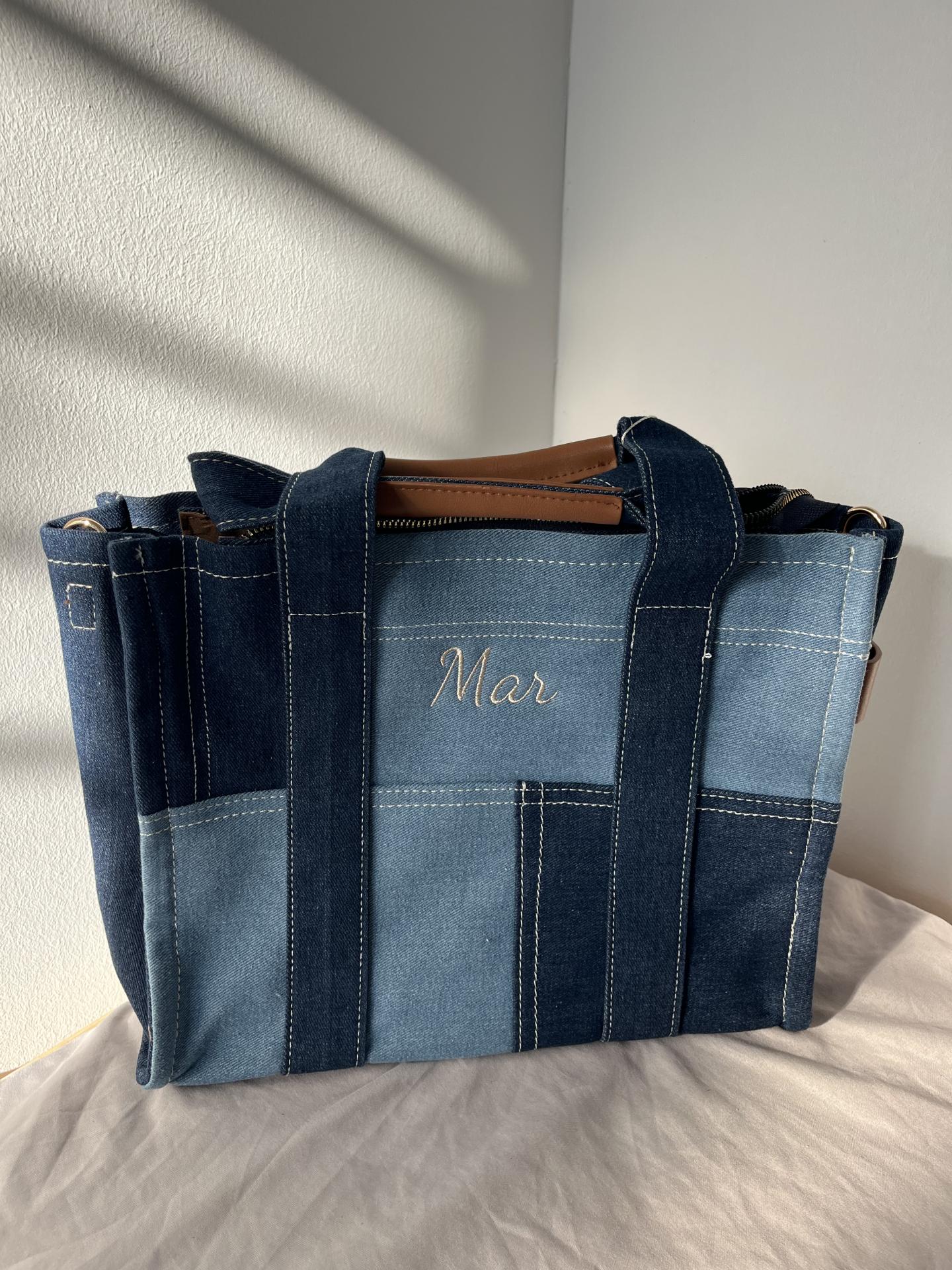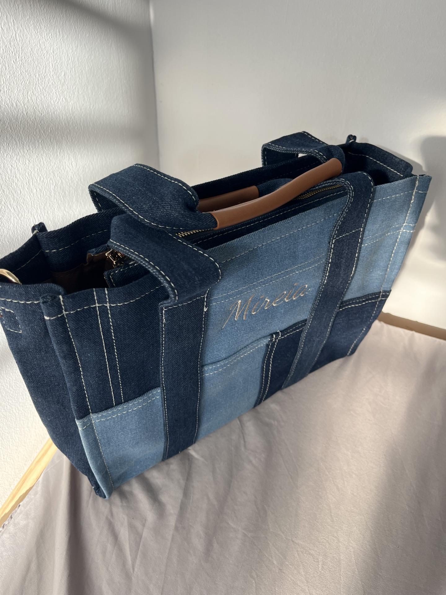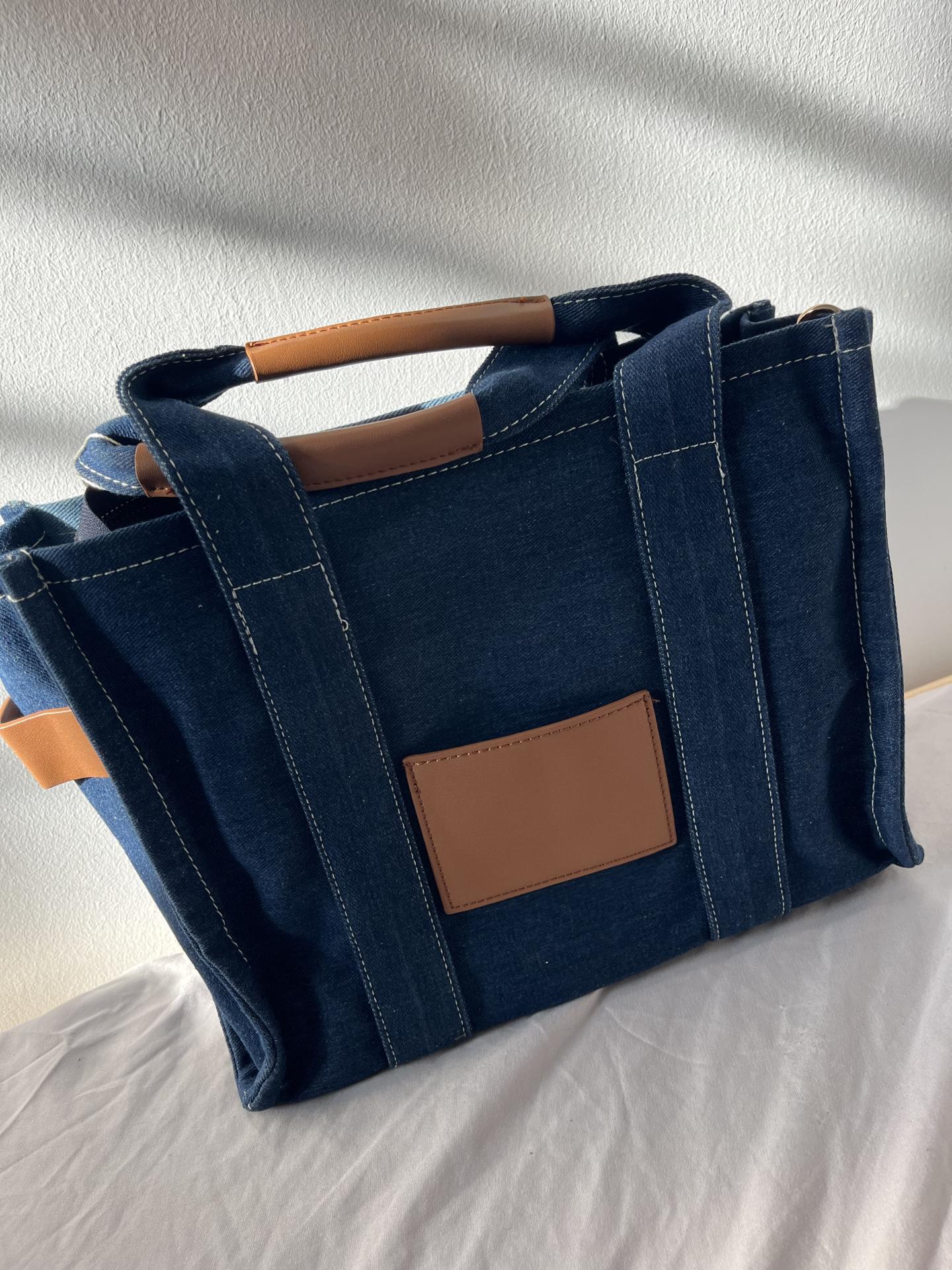 Confeccionado en loneta vaquera de distintos tonos, este bolso de tamaño mediano combina la resistencia del tejido con un diseño moderno y funcional. Sus asas cortas permiten llevarlo cómodamente en la mano, mientras que la asa larga ajustable te da la opción de usarlo al hombro o cruzado.